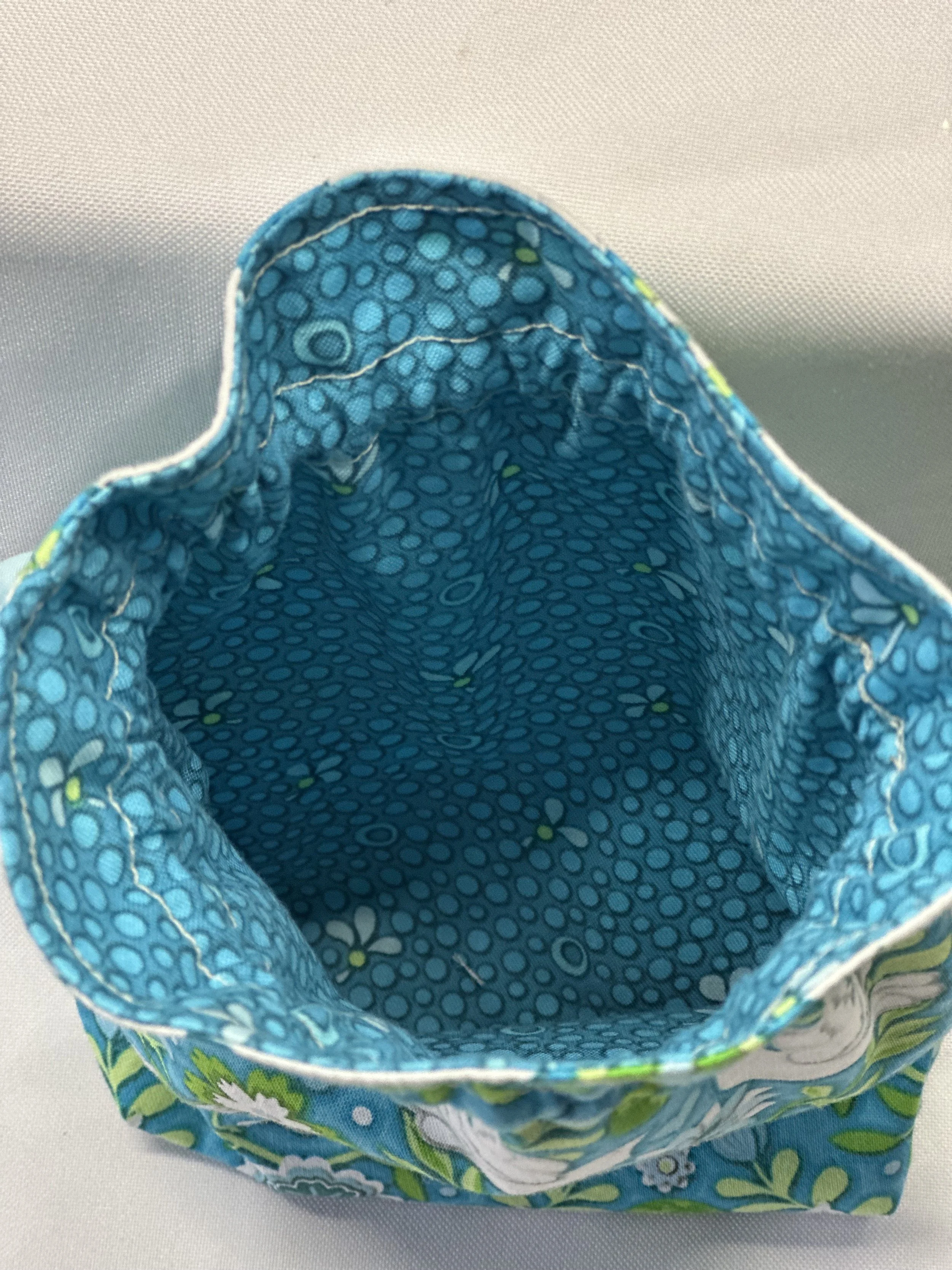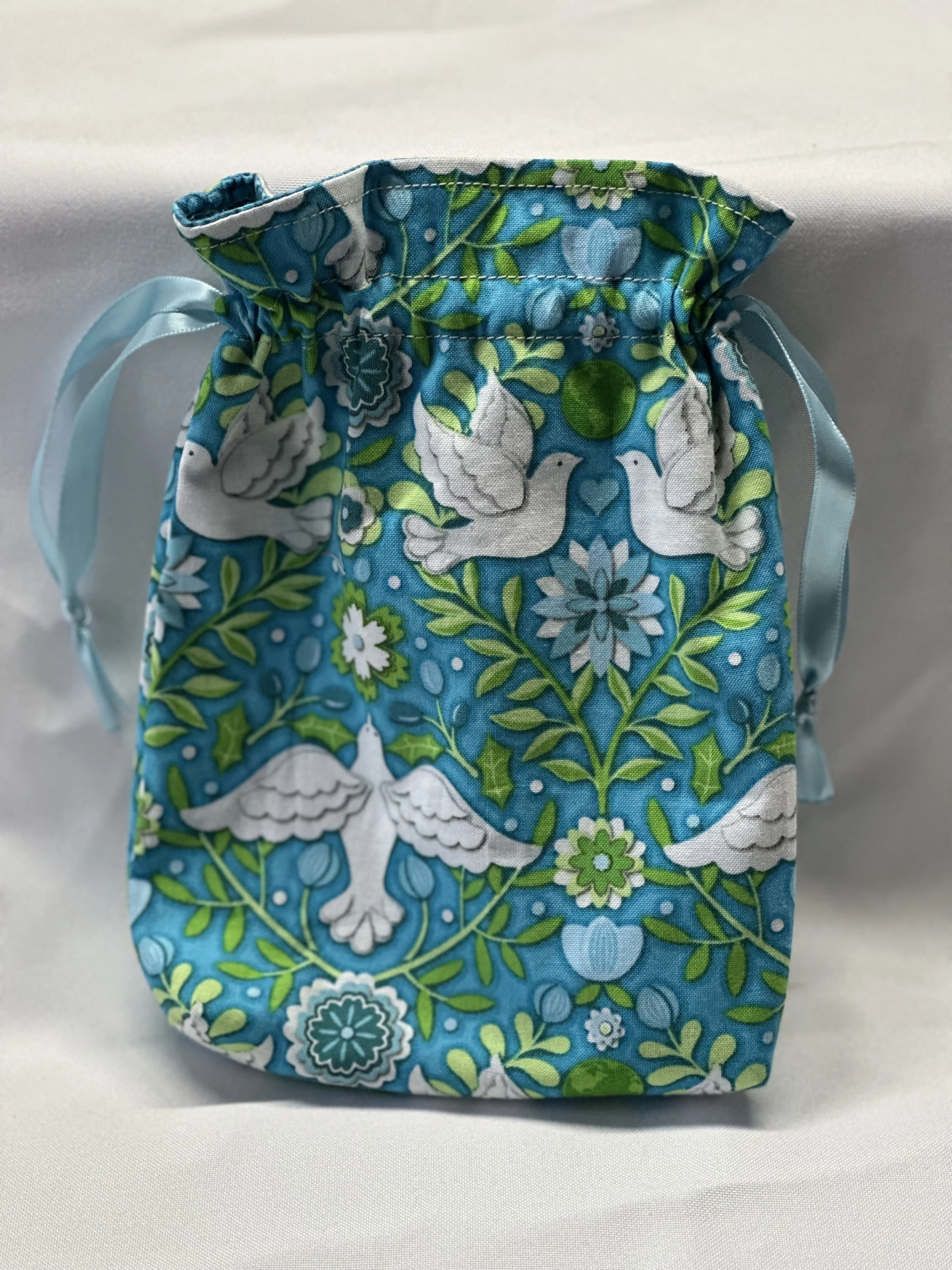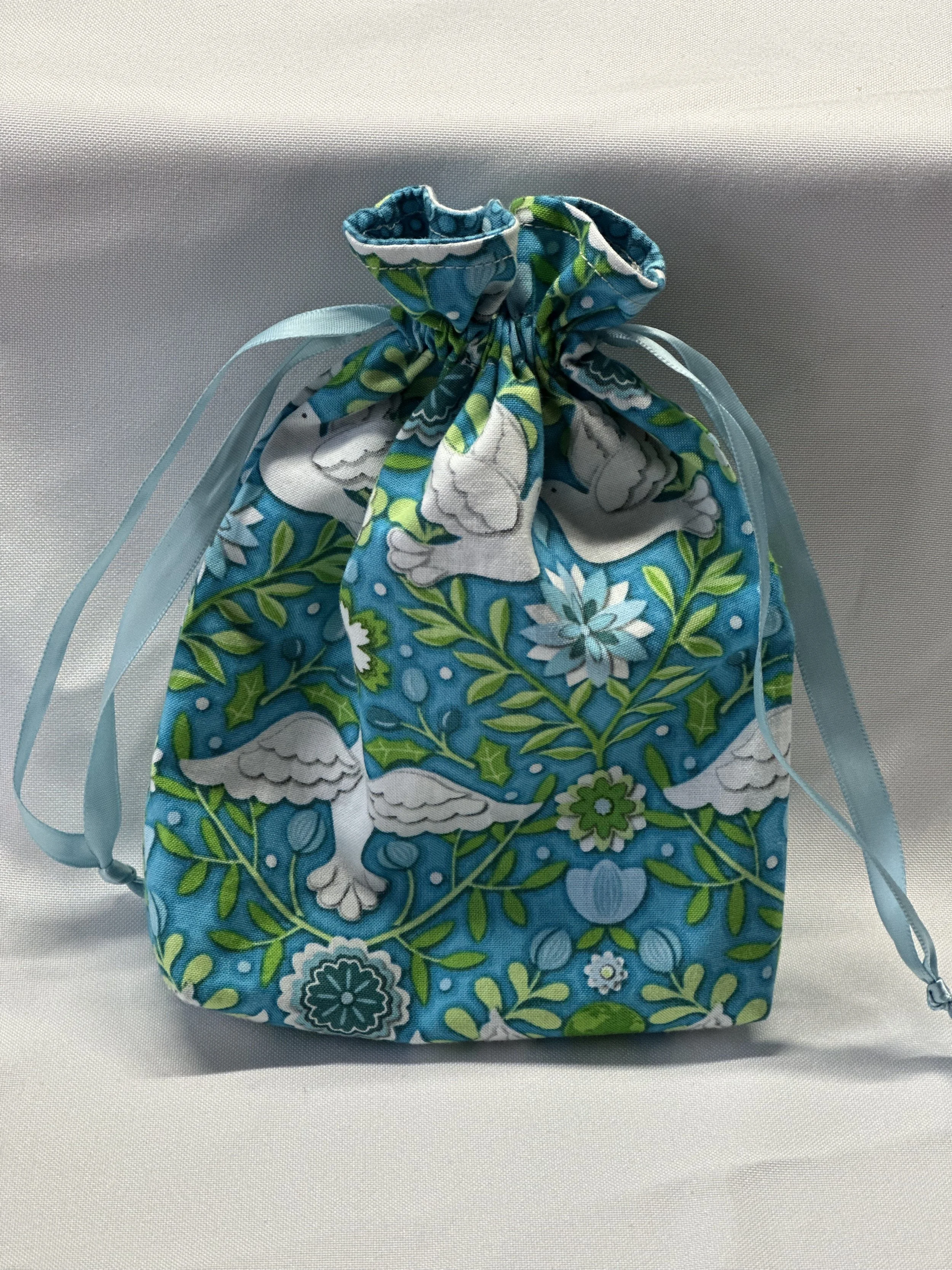 6” wide, 7” from the bottom of the drawstring to the bottom of the bag (8½” high total), and 1½” deep. Will fit a large Tarot set plus booklet (ex: MJ Cullinane cards) or a full set of oracle cards plus booklet (ex: Doreen Virtue oracle cards).