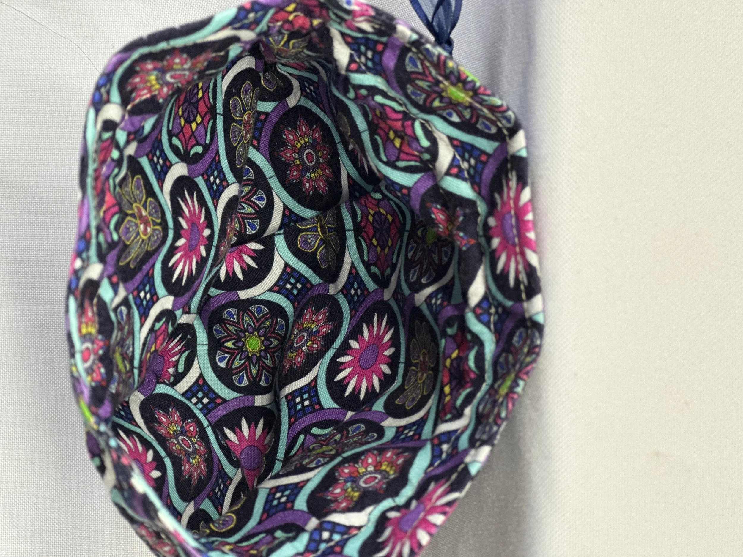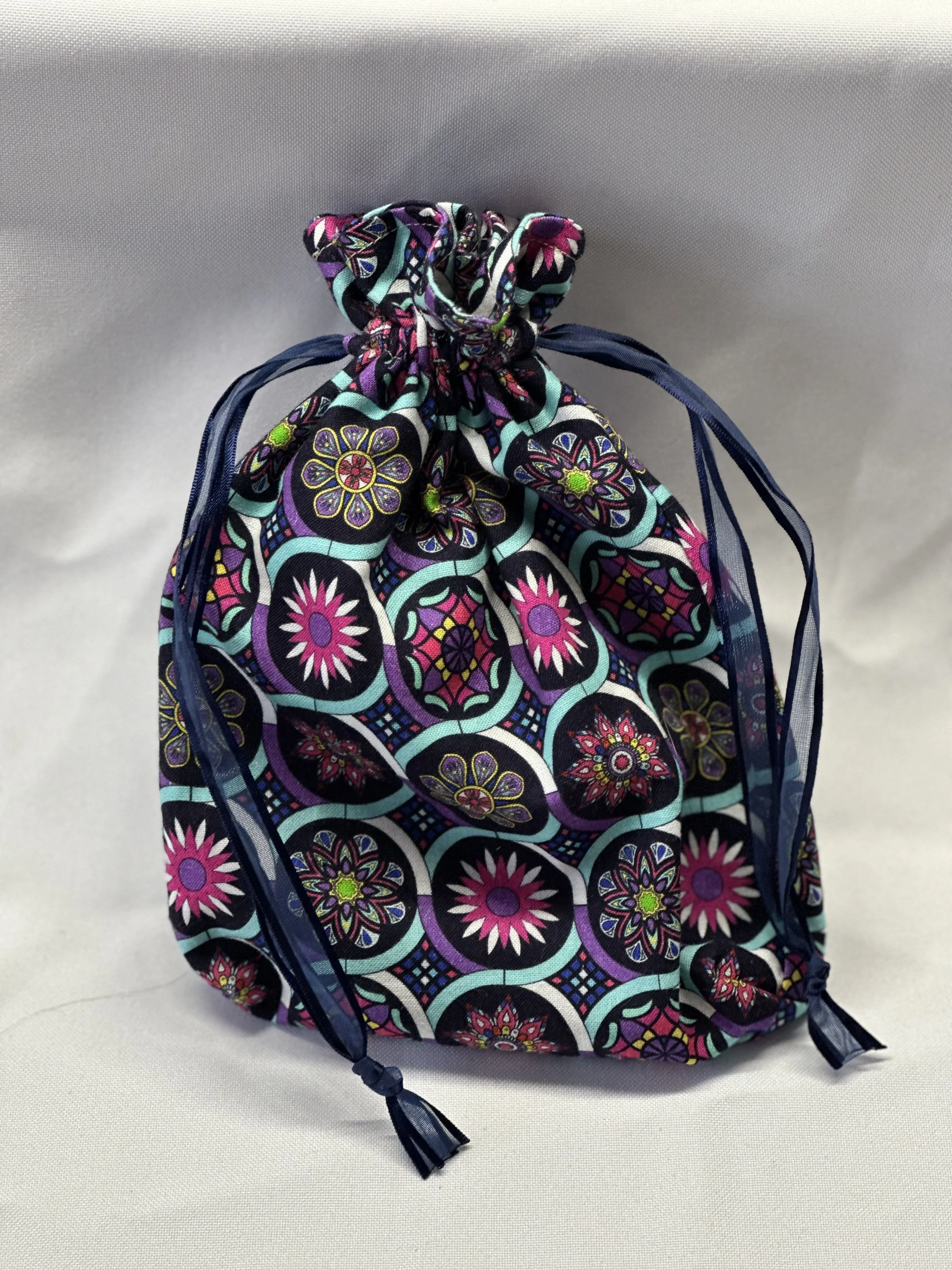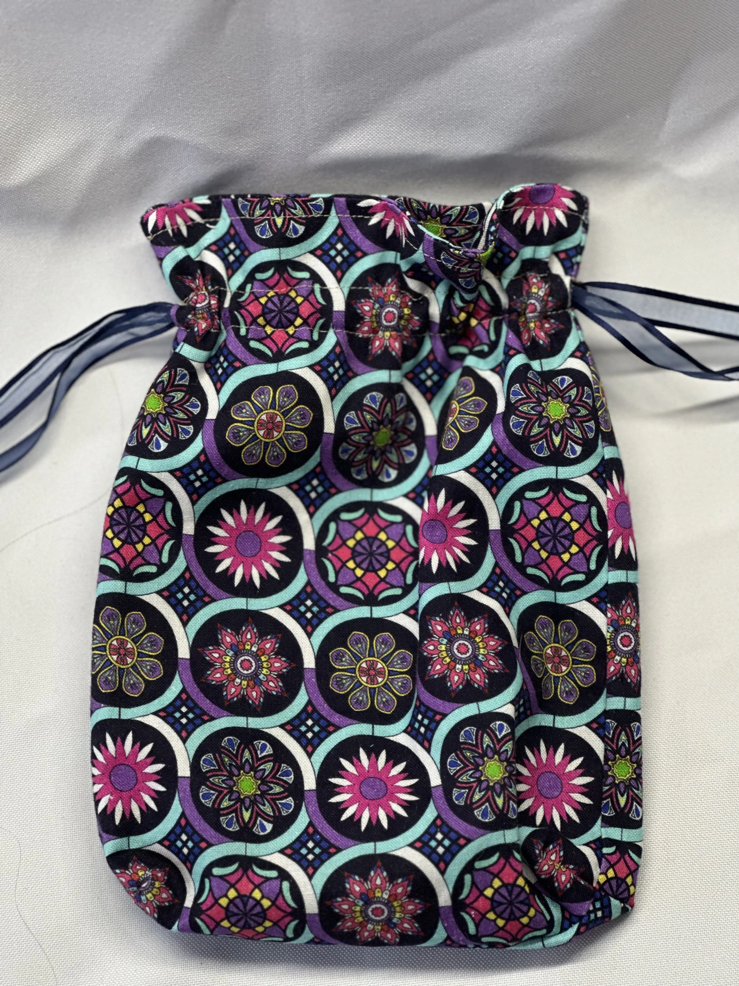 6” wide, 7” from the bottom of the drawstring to the bottom of the bag (8½” high total), and 1½” deep. Will fit a large Tarot set plus booklet (ex: MJ Cullinane cards) or a full set of oracle cards plus booklet (ex: Doreen Virtue oracle cards).