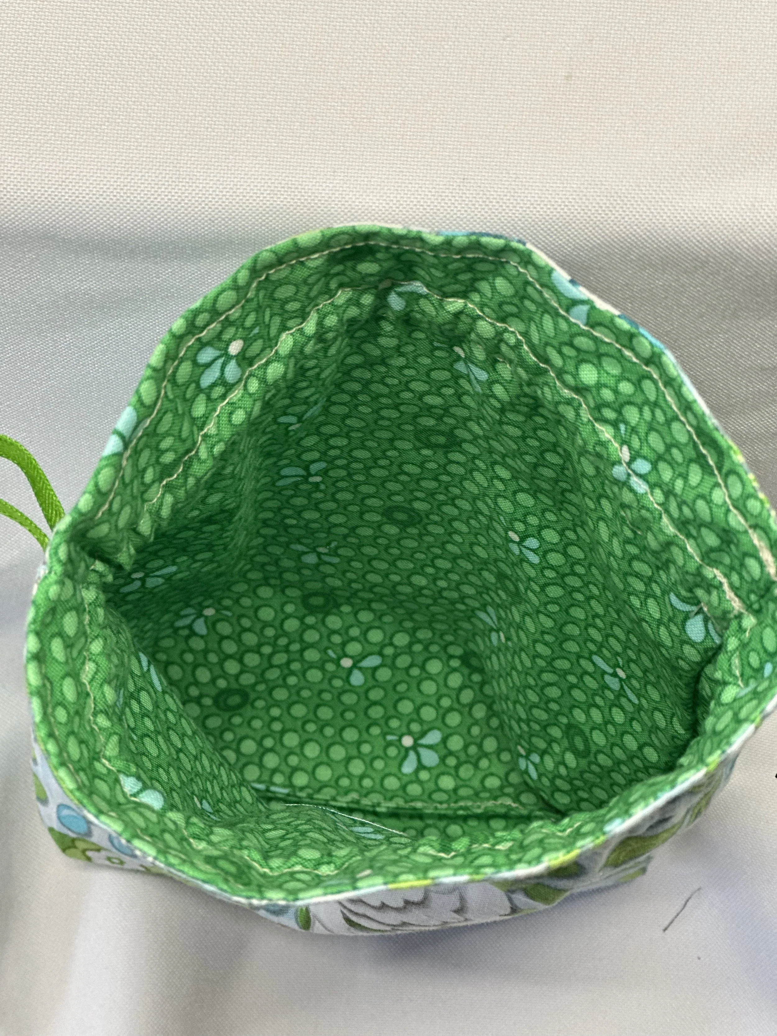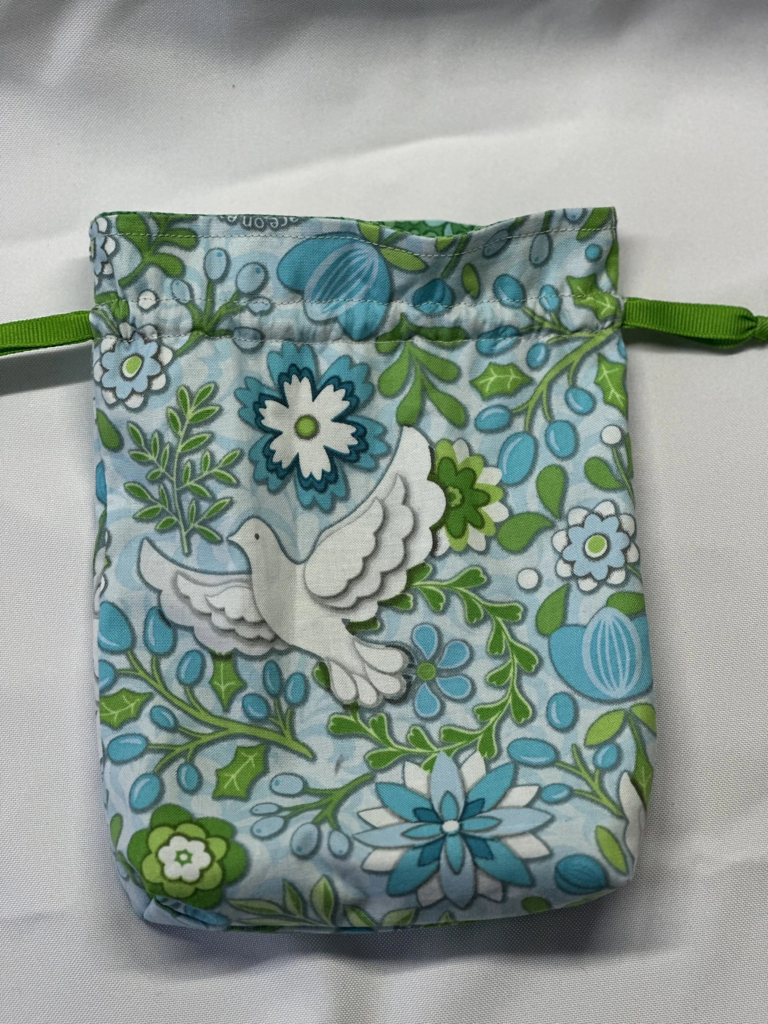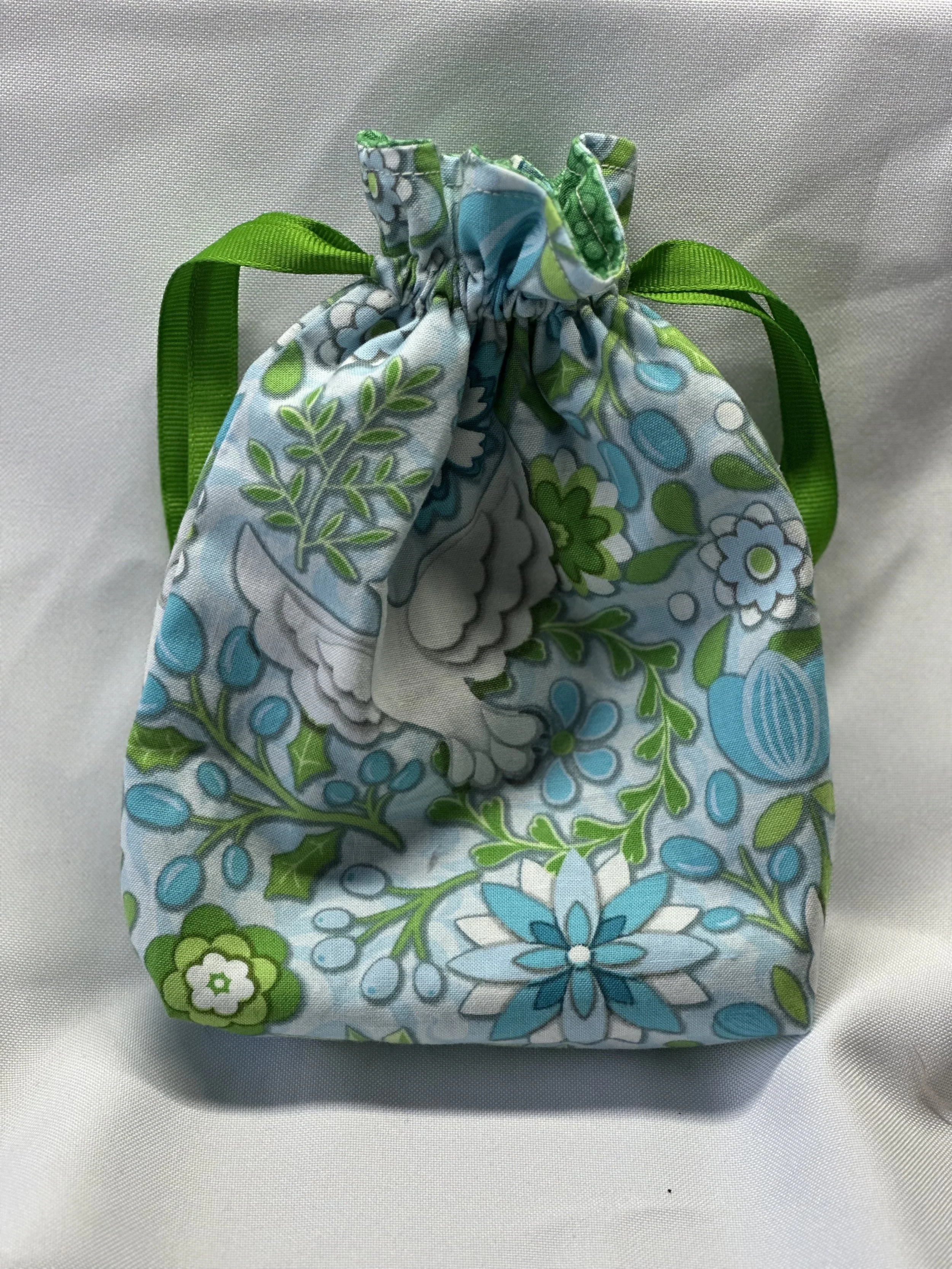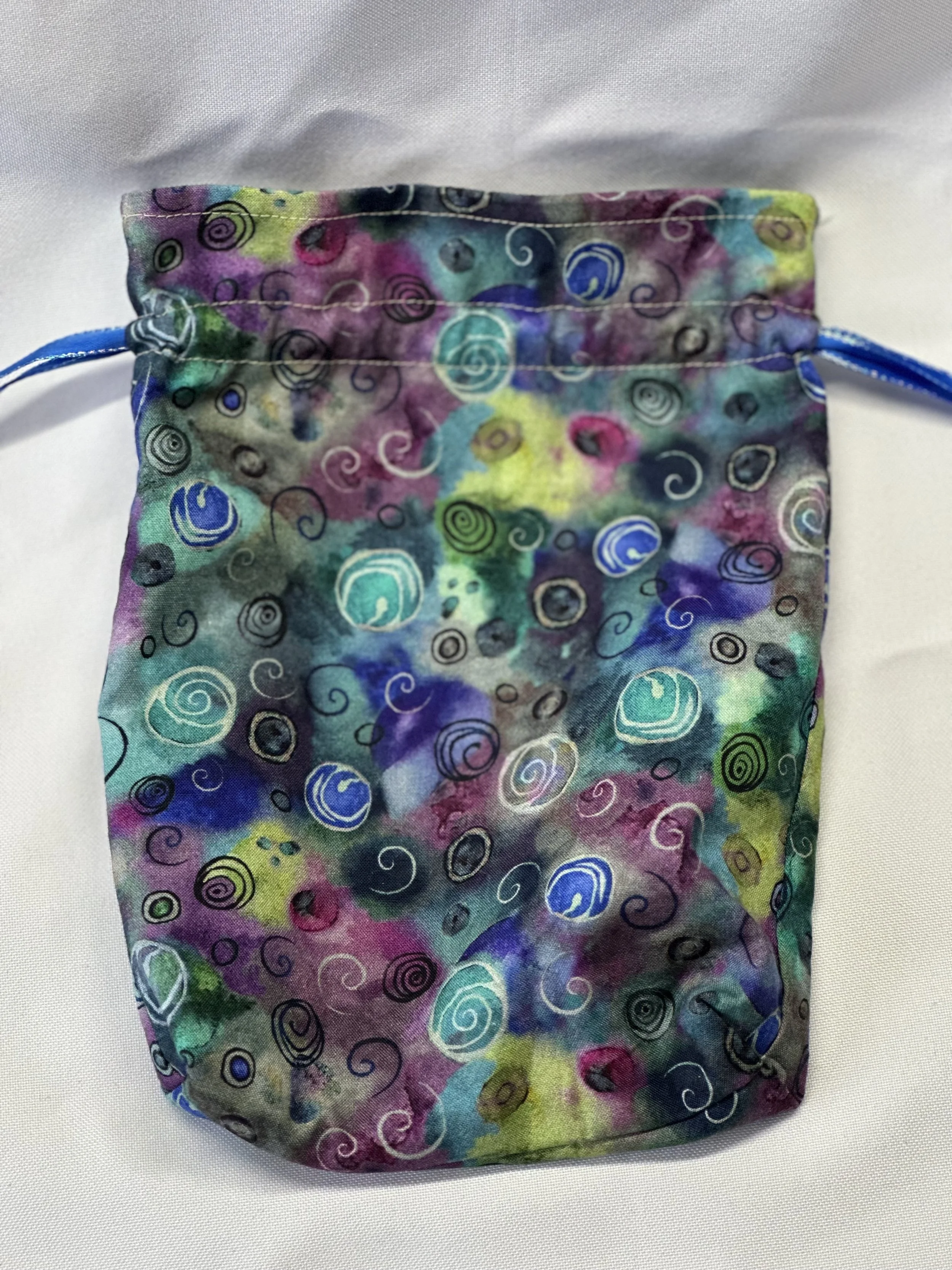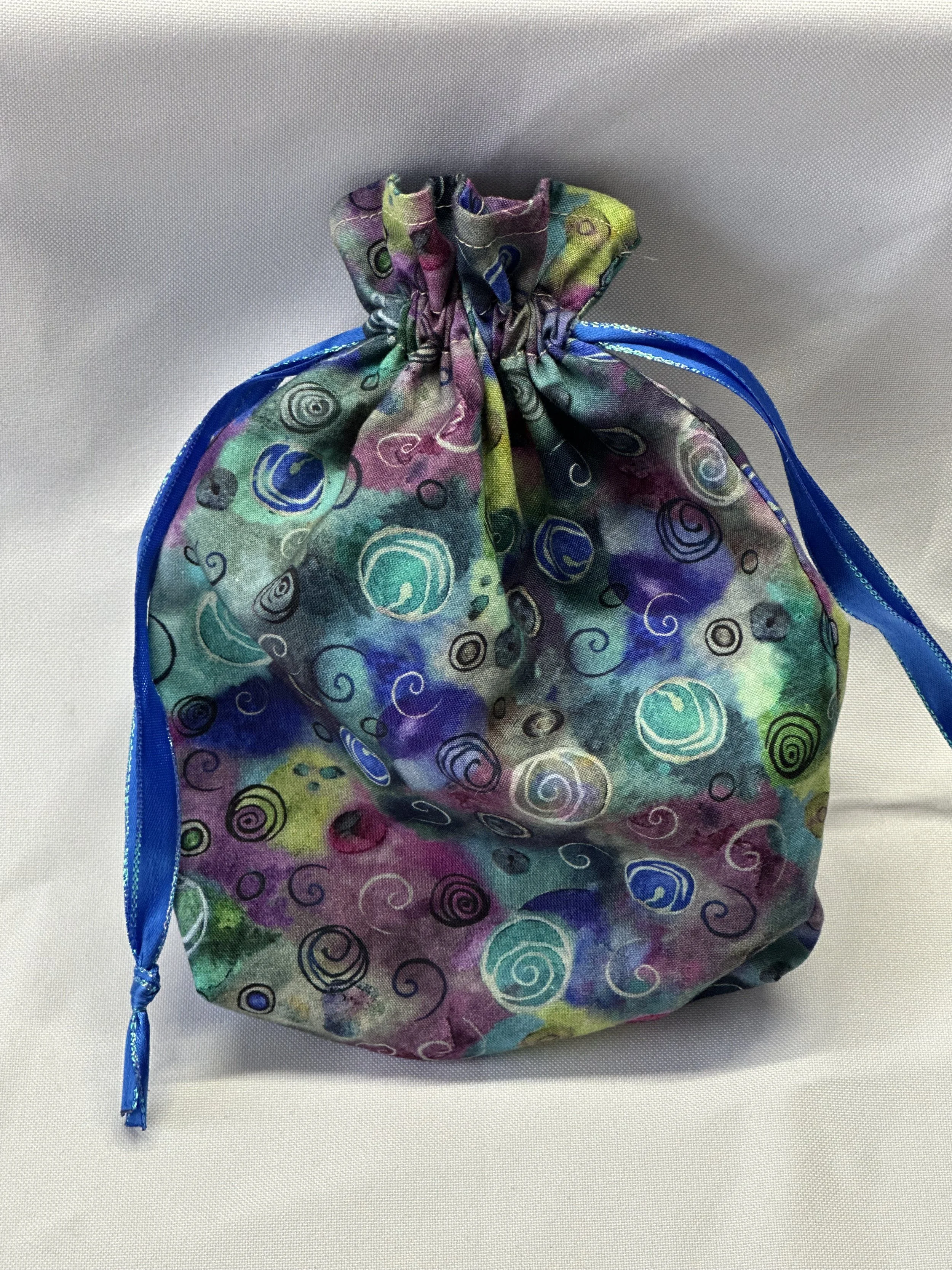 6” wide, 7” from the bottom of the drawstring to the bottom of the bag (8½” high total), and 1½” deep. Will fit a large Tarot set plus booklet (ex: MJ Cullinane cards) or a full set of oracle cards plus booklet (ex: Doreen Virtue oracle cards).